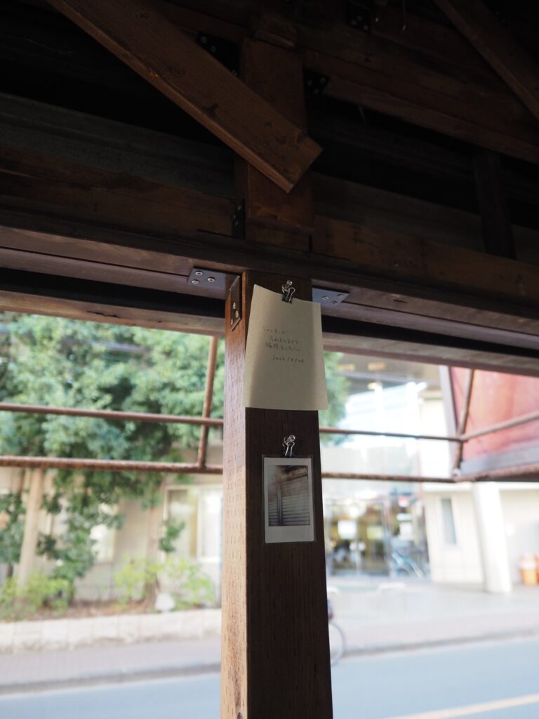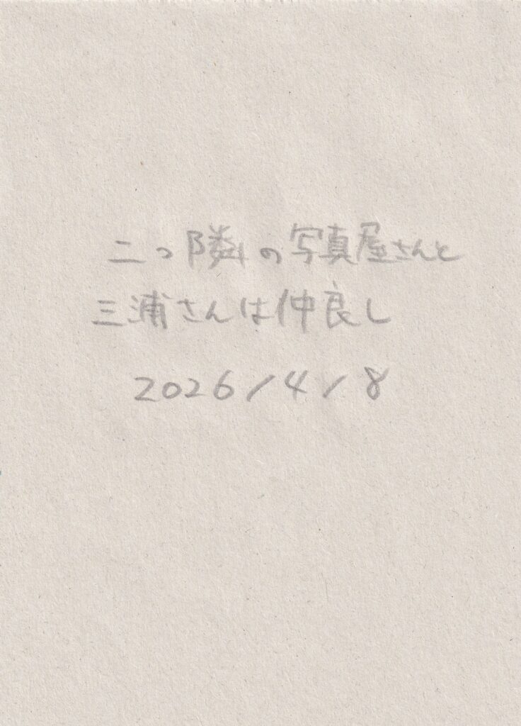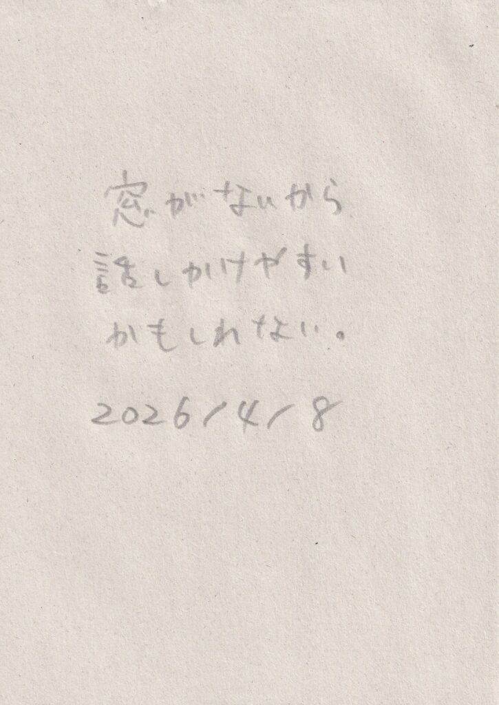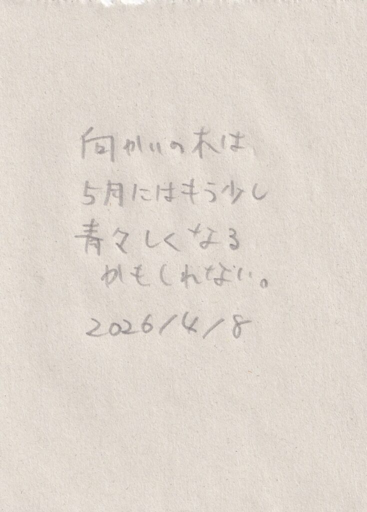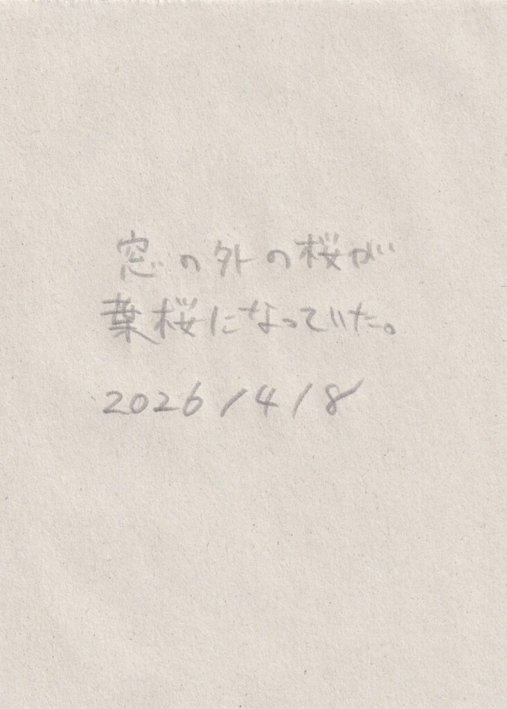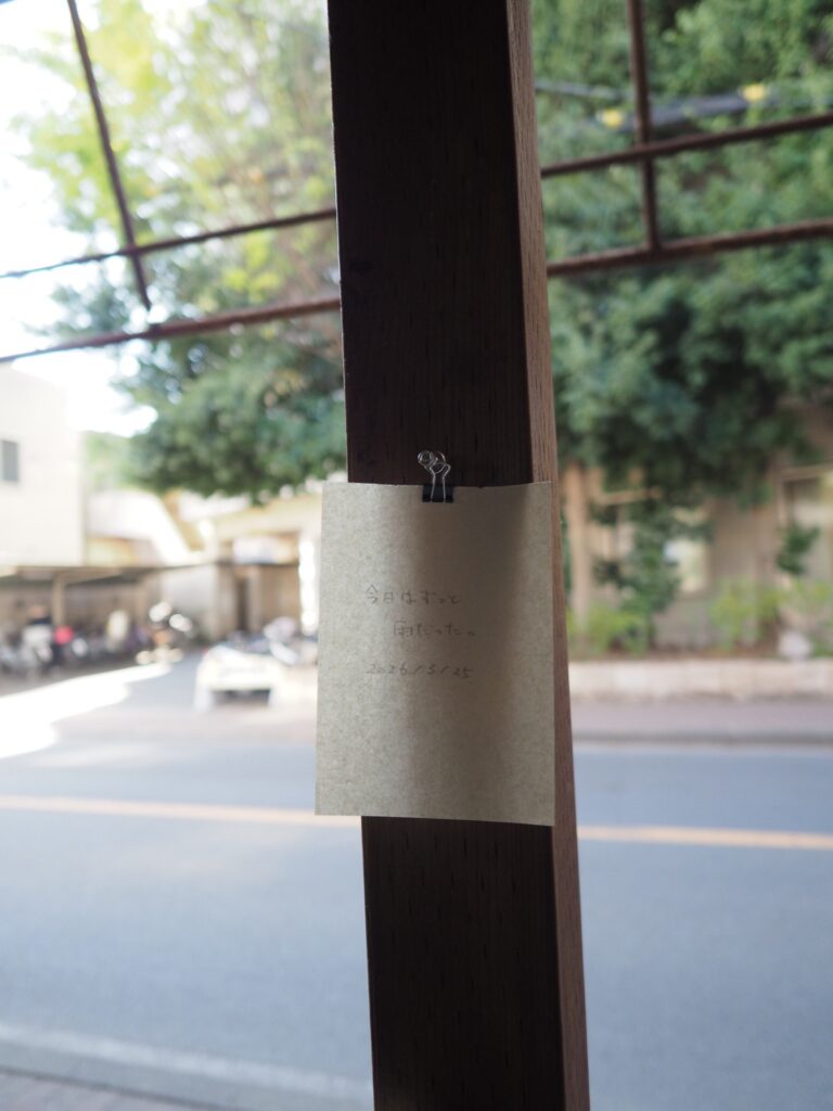 前回来た時から他に変わったところがないか探す。他はあんまり変わっていないような気もしたが、階段を上がった先に金の折り鶴が隠されていたことに気づく。窓辺には桜の花びらが落ちていた。向かいの病院の前に桜の木があり、おそらくその木のものだろう。前回、雨の中で、夕暮れで、はっきり見えなかった桜が葉桜になっていた。何枚か写真を撮り、その後、三浦さんと前回の振り返りと、自分の考えと、これからの話をした。それから何枚かまた写真を撮る。