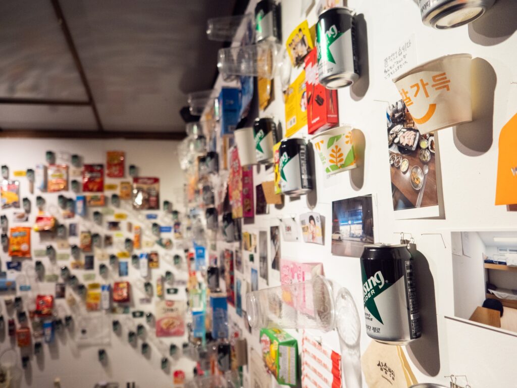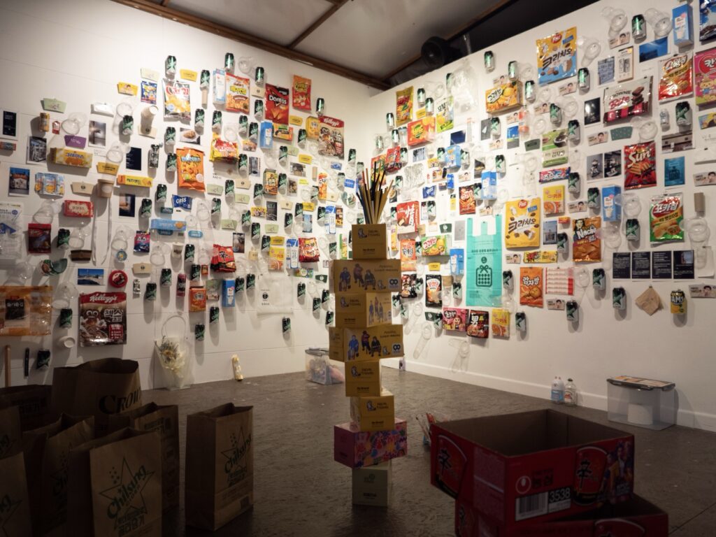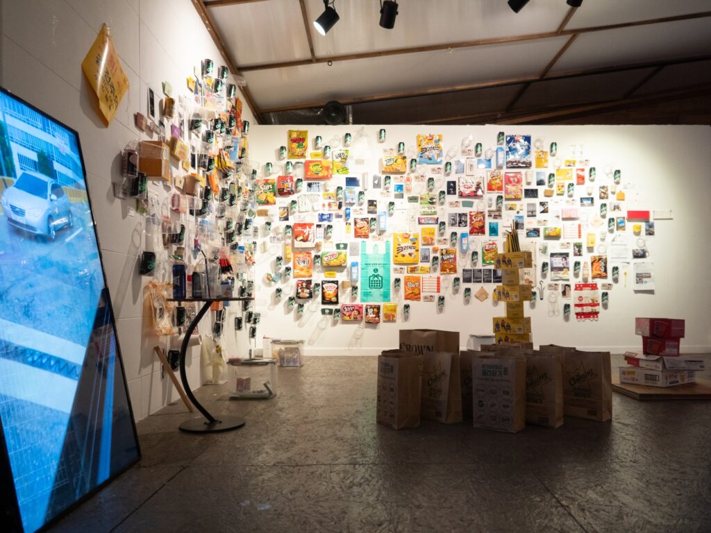 This artwork, “Saenghwal Gadeuk,” expresses reflections on the “fluctuation of value.” The everyday goods and food packages displayed on the wall were acquired by me during my stay in Gwangju, South Korea. These items, functionally, are quite similar to those easily obtainable in Japan if one doesn’t focus on the manufacturer, meaning their functional value is nearly identical. However, due to the minimal difference in the printed text or characters, they became special objects that I deemed “worth owning.” This “condition of value” is constantly unstable; I might have discarded these same items had I been in Japan. Value is not absolute; it fluctuates dynamically based on the place and circumstances of acquisition, or in the case of a gift, the relationship and time associated with the object. By also incorporating photographs taken in Gwangju during my stay alongside these everyday items, the artwork attempts to reconstruct their inherent value into something even more “valuable,” strongly connecting it with my personal experience. The title, “Saenghwal Gadeuk,” is taken from the text printed on a paper cup I acquired on my first day in Korea. When I asked for the meaning of the phrase, I was told it “doesn’t have any particular meaning.” This phrase, for which a clear answer could not be obtained despite pursuing its meaning, attempts to settle within the work the ambiguity at the border of language and culture, and the very sense of everyday life that is, nonetheless, “full of life.